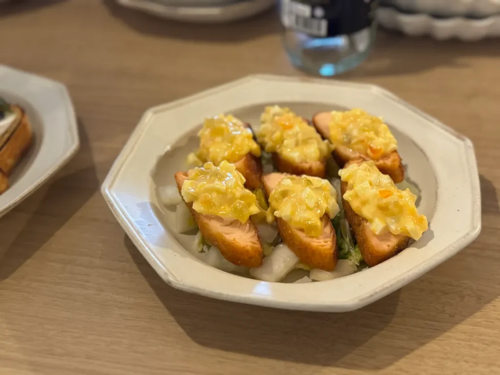 ● サーモンのカツレツ 味噌マヨネーズと白瓜粕漬のタルタルソース 白菜の塩麹和え