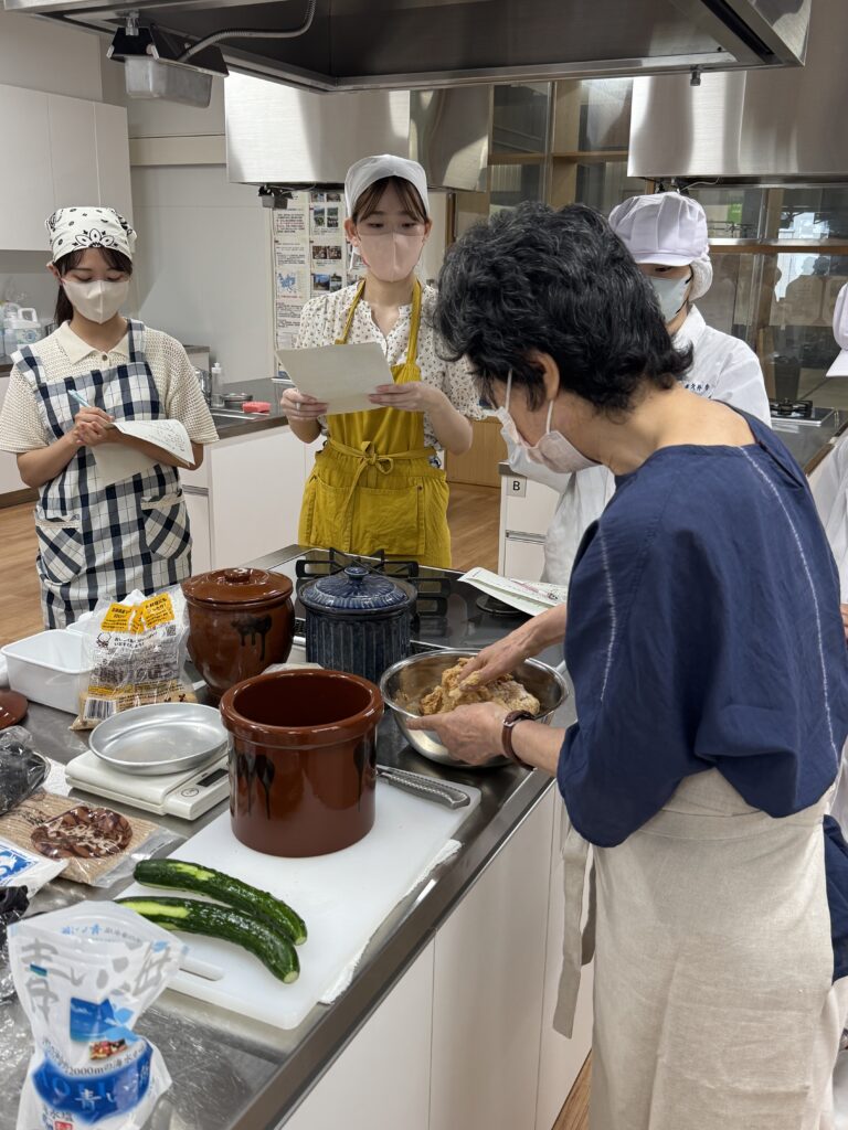 - 横山タカ子氏による実習(2025年8月) 「きゅうりの酒粕漬け」「なすの塩漬け」など、伝統的な漬物の製造技法を実践的に学びました。
