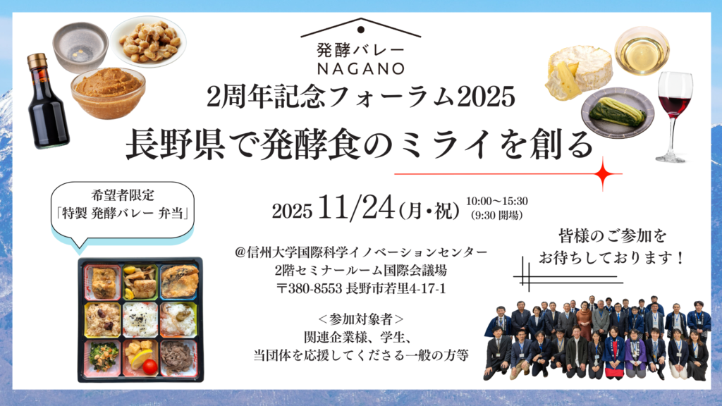 発酵バレーNAGANO設立1周年フォーラム「長野県で発酵食のミライを創る」 2024年11月24日(日)、発酵バレーNAGANOの設立1周年を記念して、フォーラム「長野県で発酵食のミライを創る」が開催。長野県内の発酵食品産業に携わる若手経営者や専門家が一堂に会... -